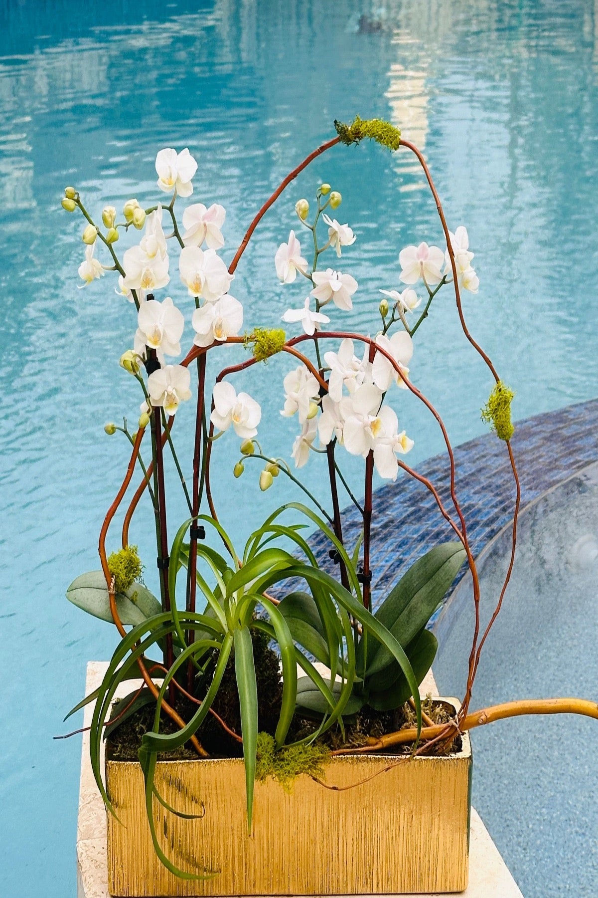 This delicate white orchid blooms, with an artistic willow formations, and the unique presentation of a moss-covered sphere creates a harmonious centerpiece, transforming any space into a sanctuary of natural elegance.